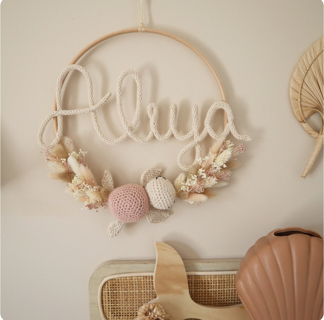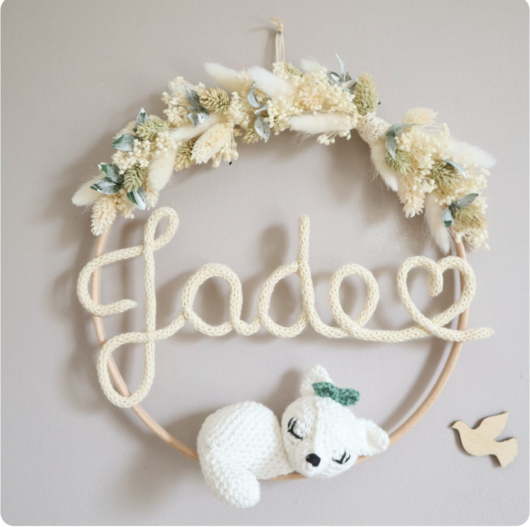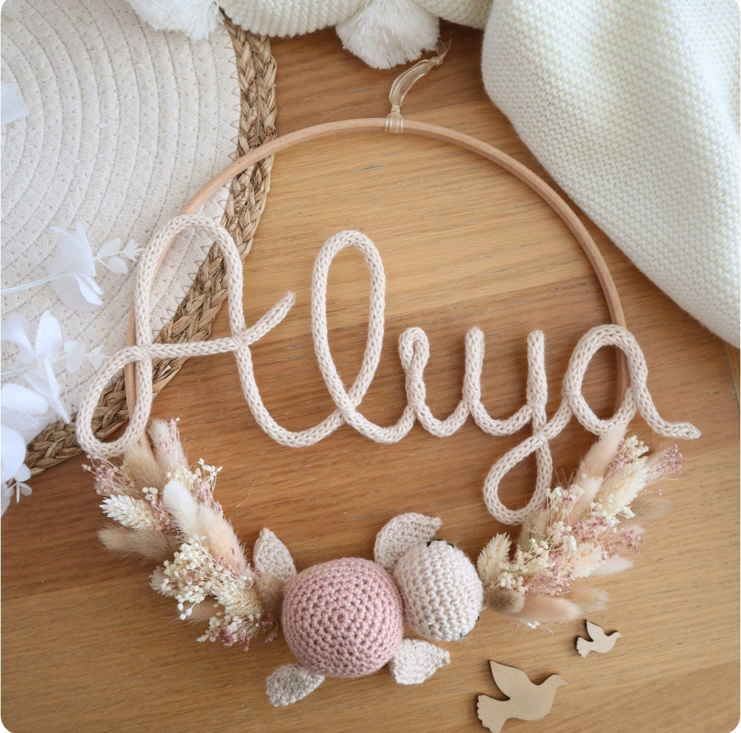 - d'un prénom ou mot,en tricotin, couleur au choix parmis le nuancier