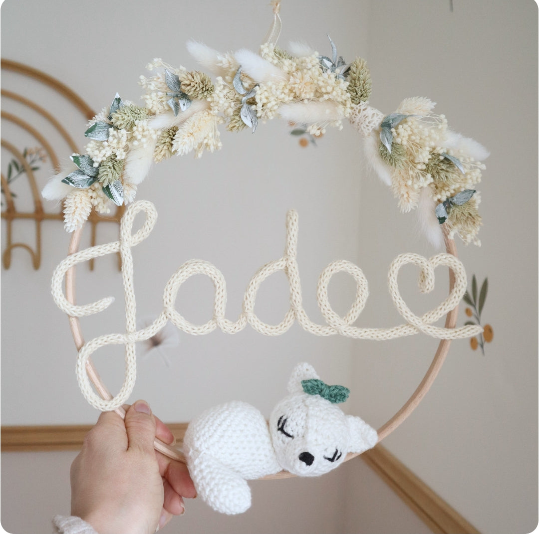 - d'un animal en crochet; l'animal est à choisir parmi biche, renard, ourson, lion, panda, lapin, chat, paresseux, tortue, poulpe, koala, baleine, dinosaure, et le coloris peut-être choisi parmi toutes les couleurs du nuancier , visible en faisant défiler les images.