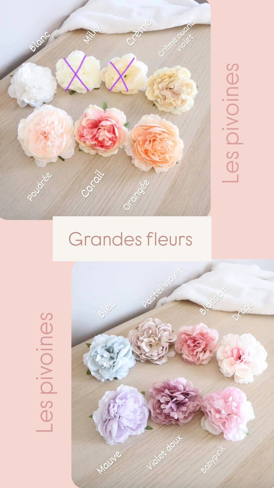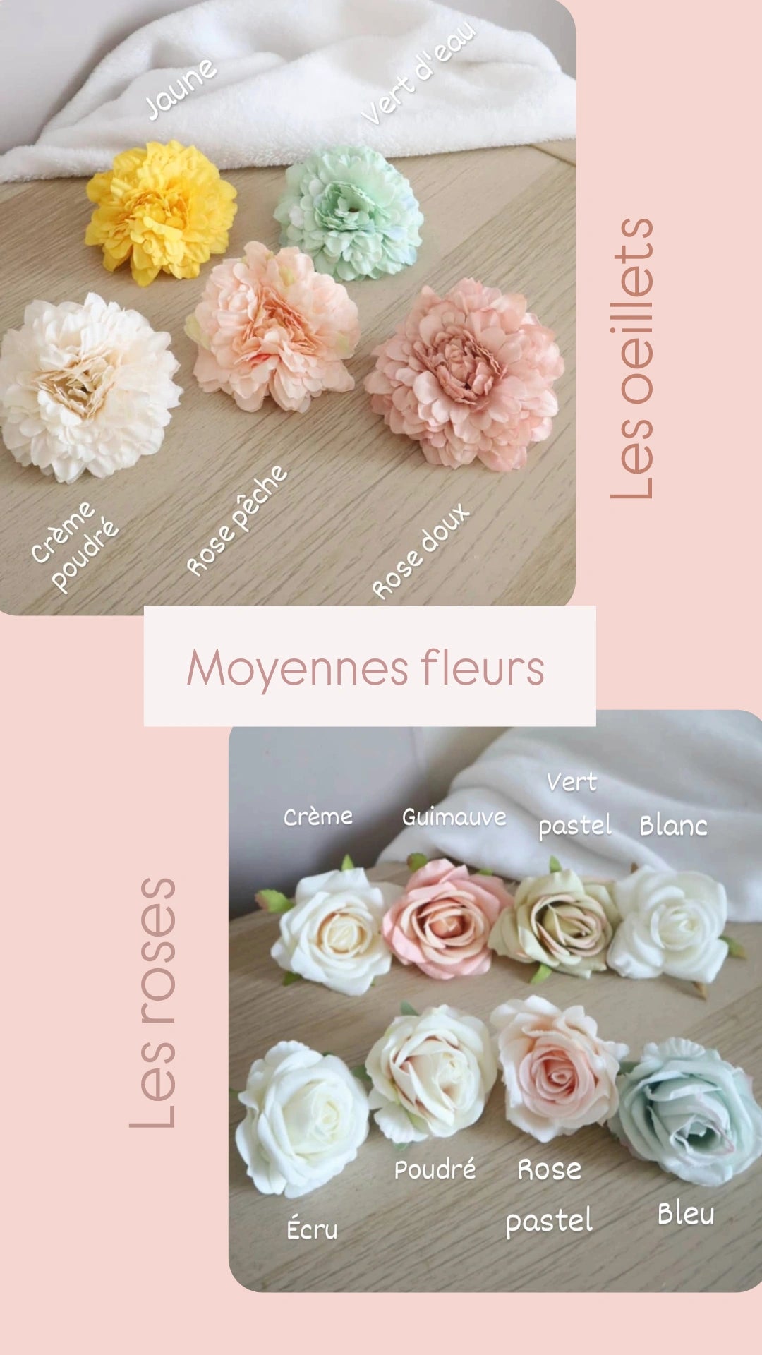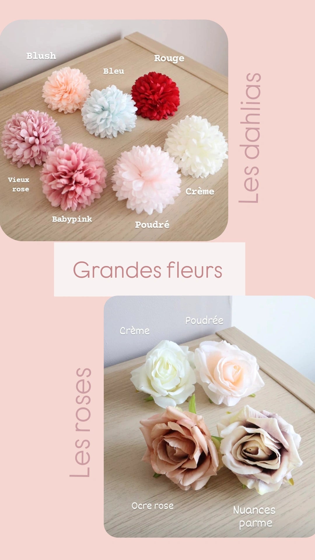 - le décor: les fleurs de votre choix selon le nuancier: idéalement une grande et 2 petites, ou une grande et deux moyennes, ou une moyenne et 2 petites... toutes les fleurs n'ont pas la même taille et certaines fonctionnent mieux entre elles. N'hésitez pas à m'envoyer un message si vous avez un doute, et je vous contacterai si votre sélection nécessite un ajustement. Vous pouvez choisir des feuillages, et ballons et pompons en option.