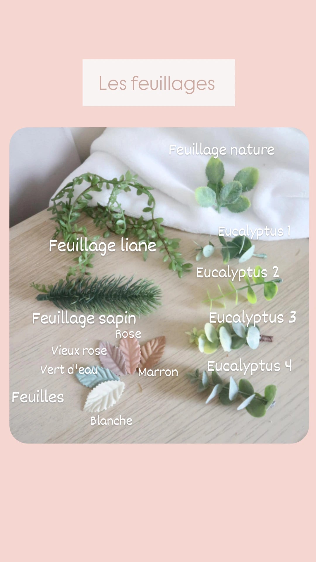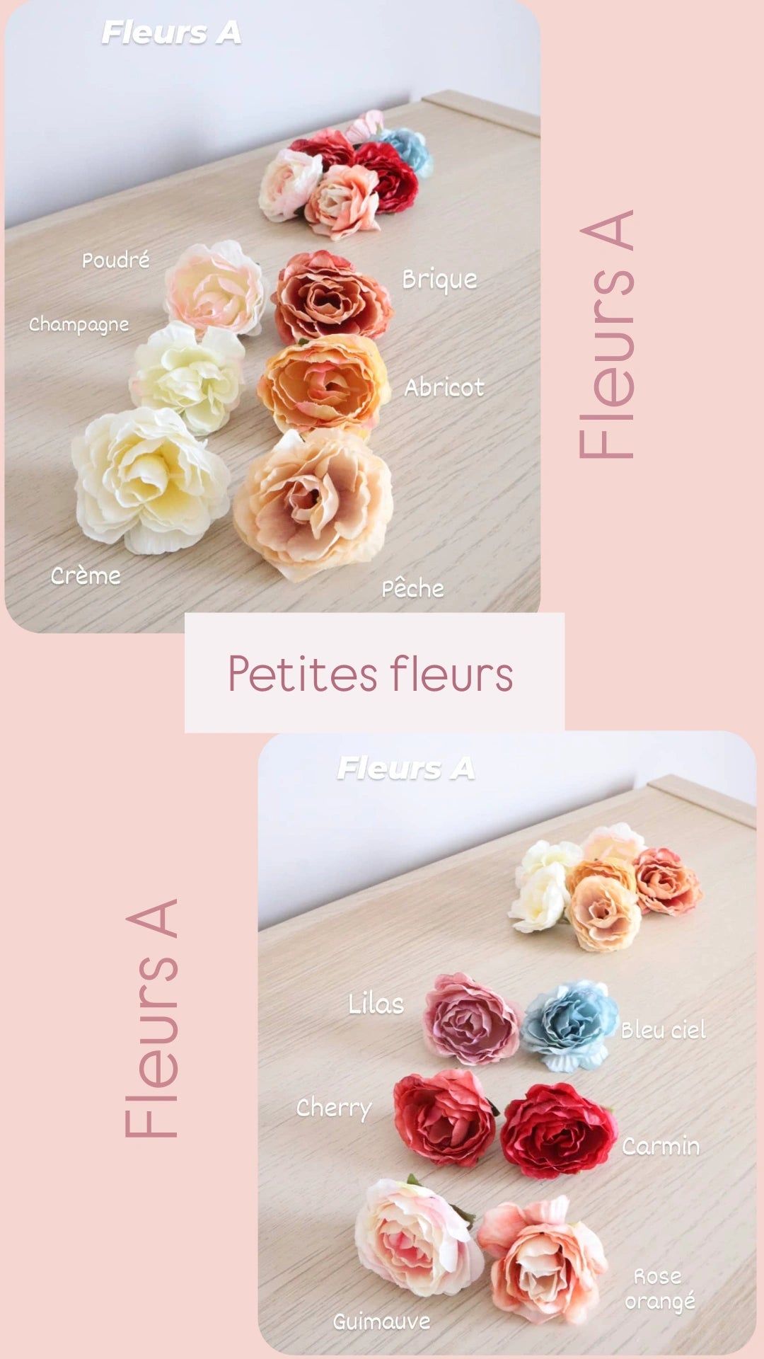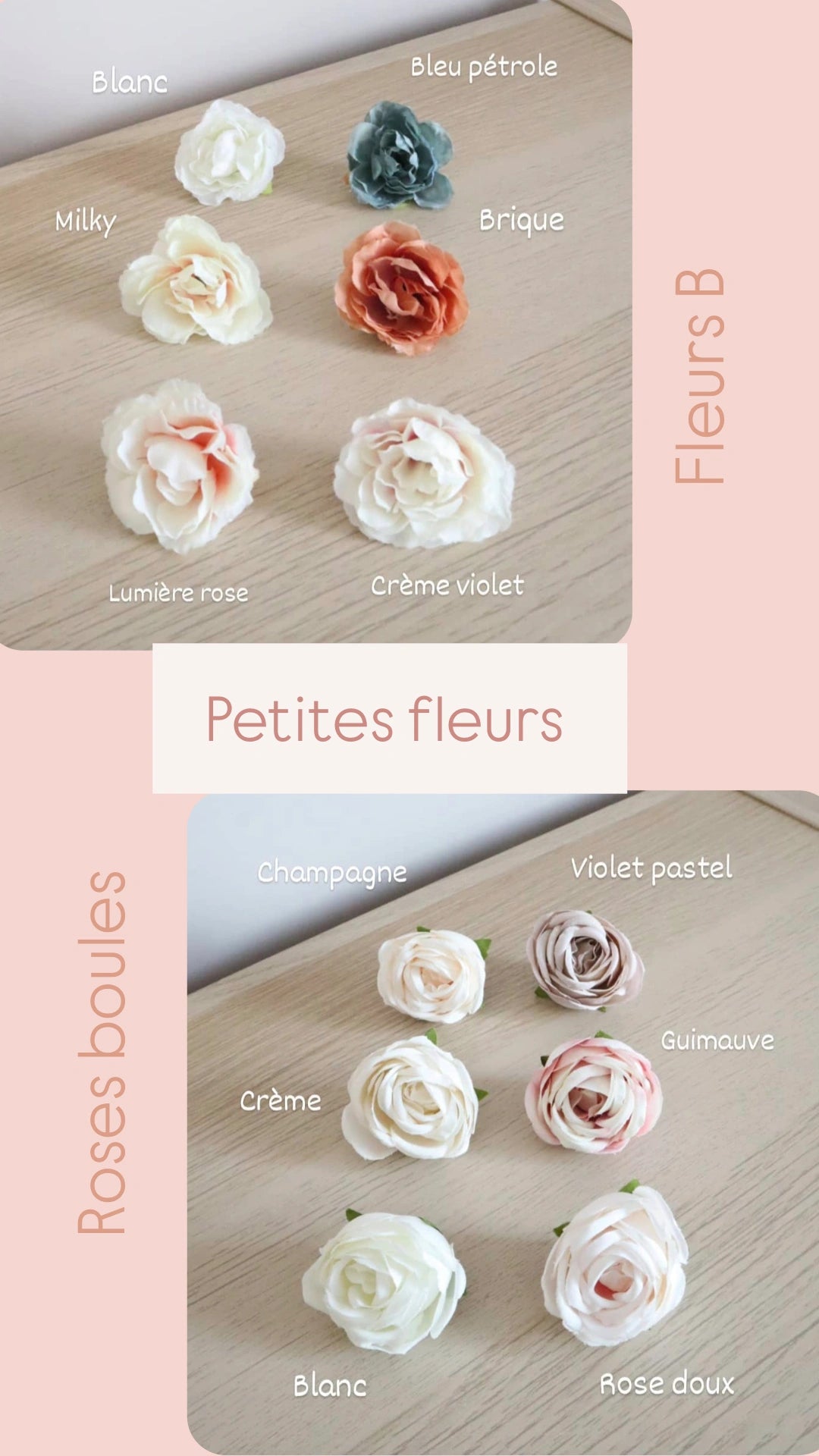 - le décor: les fleurs de votre choix selon le nuancier: idéalement une grande et 2 petites, ou une grande et deux moyennes, ou une moyenne et 2 petites... toutes les fleurs n'ont pas la même taille et certaines fonctionnent mieux entre elles. N'hésitez pas à m'envoyer un message si vous avez un doute, et je vous contacterai si votre sélection nécessite un ajustement. Vous pouvez choisir des feuillages, et ballons et pompons en option.